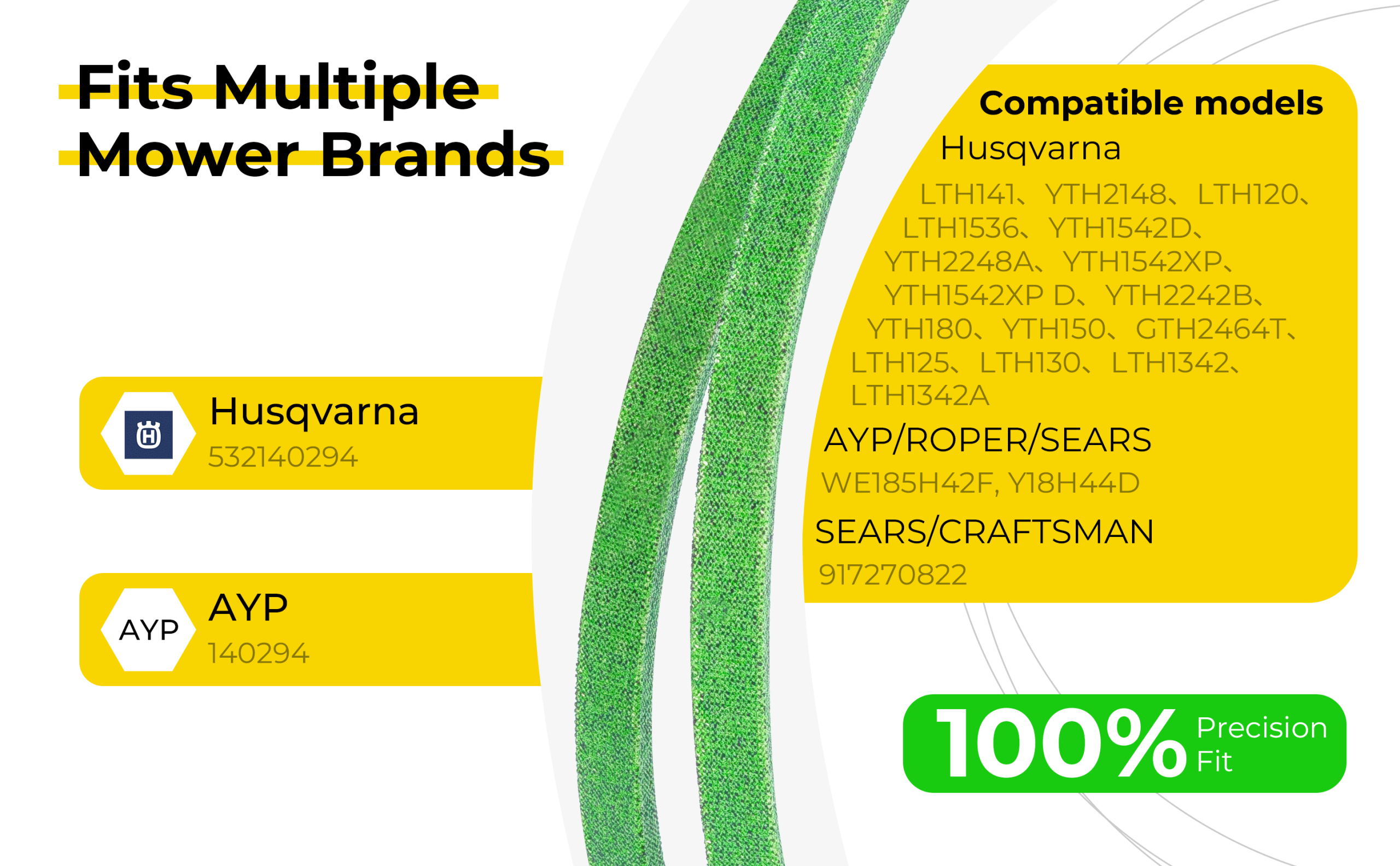 - 【OEM MATCHED COMPATIBILITY】140294 Ground Drive Belt, precisely sized at 1/2″ x 82-1/4″, replaces OEM part numbers: Craftsman 532140294, 24103; Husqvarna 531300768, 532140294; Jonsered 532 14 02-94; and Poulan, Weed Eater, McCulloch models using 532140294. Compatible with Craftsman DYT4000, LTX1000; Husqvarna YTH150,YTH130, LTH130, LTH141, LTH1542, LTH1742, LTH18542; Poulan PB195H42LT; Jonsered LT2115, LT2117A, LT2120A2, LT2122A2; Weed Eater WE185H42B; and other AYP 42” deck riding lawn tractors.