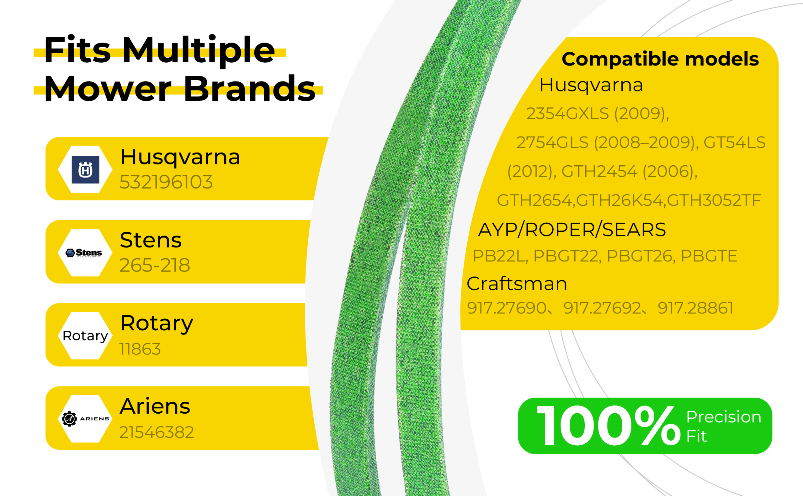 - 【OEM MATCHED COMPATIBILITY】196103 mower deck belt built to OEM spec 147.5″ x 0.625″. Replaces AYP/Husqvarna 196103, 53219610, 532196103, 587686701, 531309478; Craftsman 33155; Ariens 21546382. Compatible with Husqvarna LGT2654, LGT2554, YTH24V54, YTH22V46, YTH22K54, YTH24V54XLS, GTH2654, GTH2654T, GTH26V54, GTH260; AYP PB22H54BFX; Craftsman 917.289640 and other 54″ deck riding lawn mowers. Engineered for smooth performance and durable power transfer.